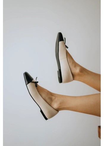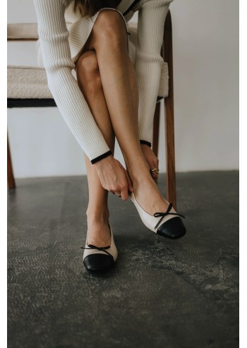 A classic round-toe ballet silhouette with a contrasting black cap.