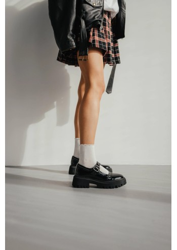 High-shine patent leather upper with classic Mary Jane laces for a secure, polished fit.
